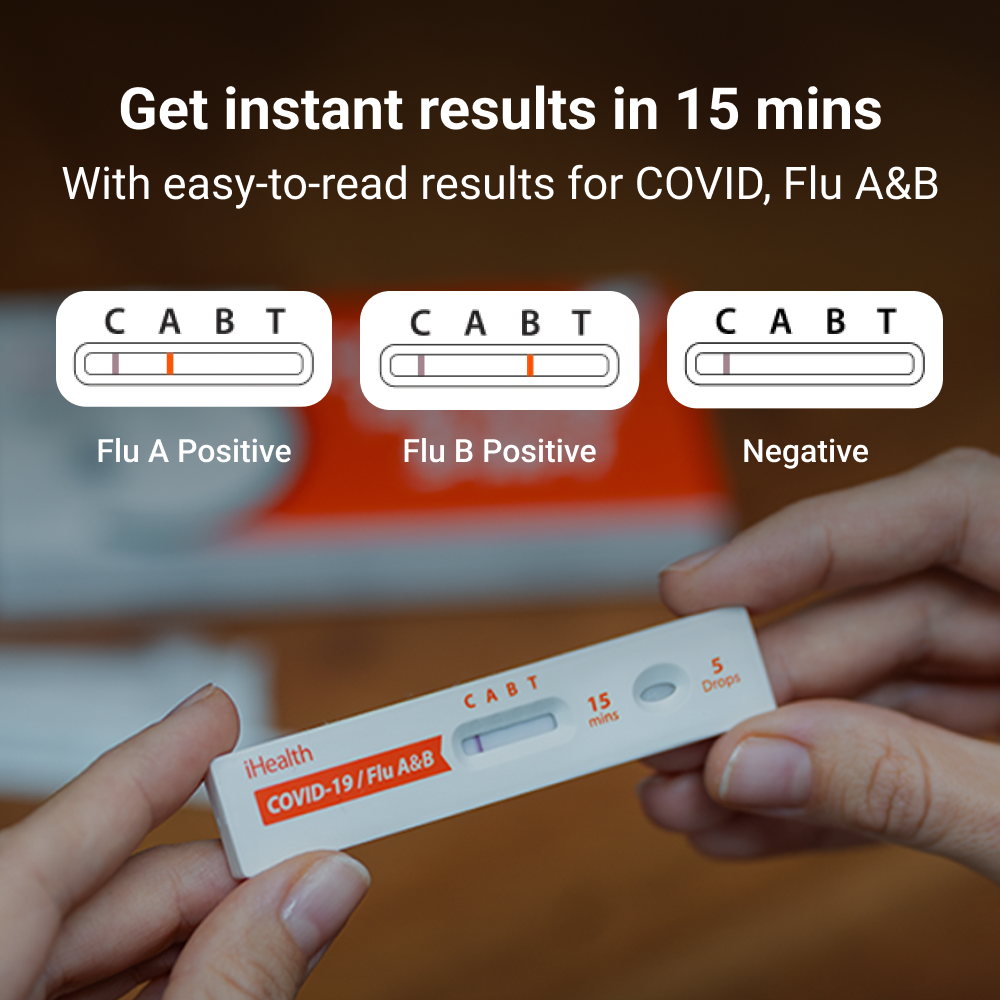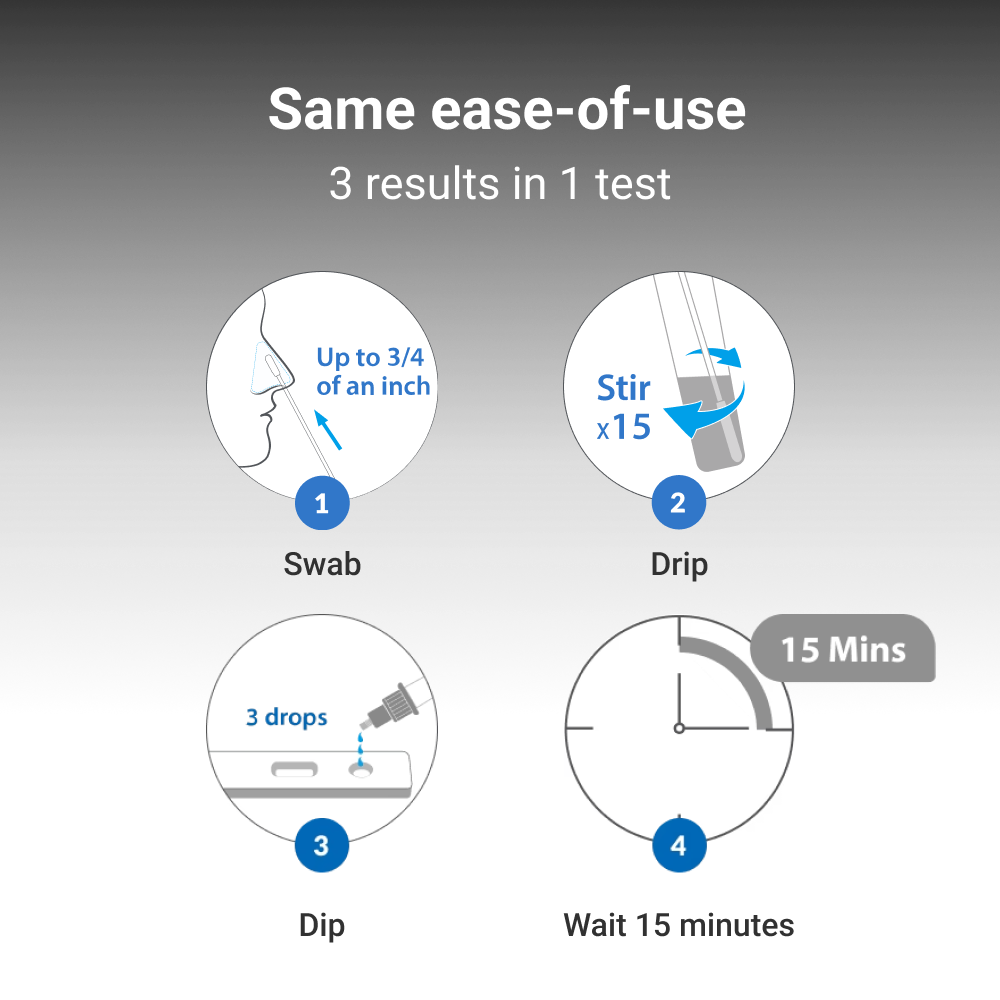 - Same ease of use with 3 tests now in 1. Utilizing the familiar 4 user-friendly steps of at-home COVID tests, you can now get all 3 results for COVID-19 and Flu A & B at once with 5 drops of sample.