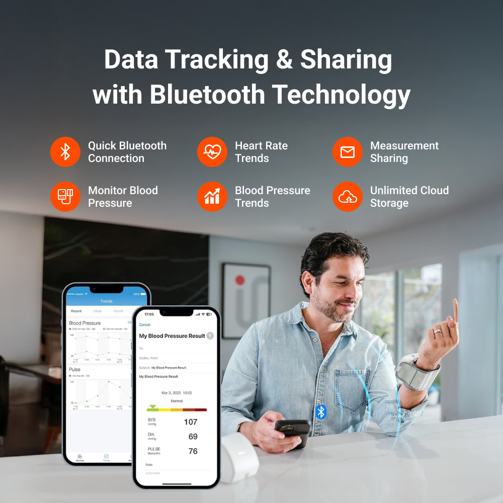 • Effortless data syncing. Built-in Bluetooth syncs readings to our free app for easy tracking, storing, and sharing with doctors. Monitor stores 99 readings, app stores unlimited data.